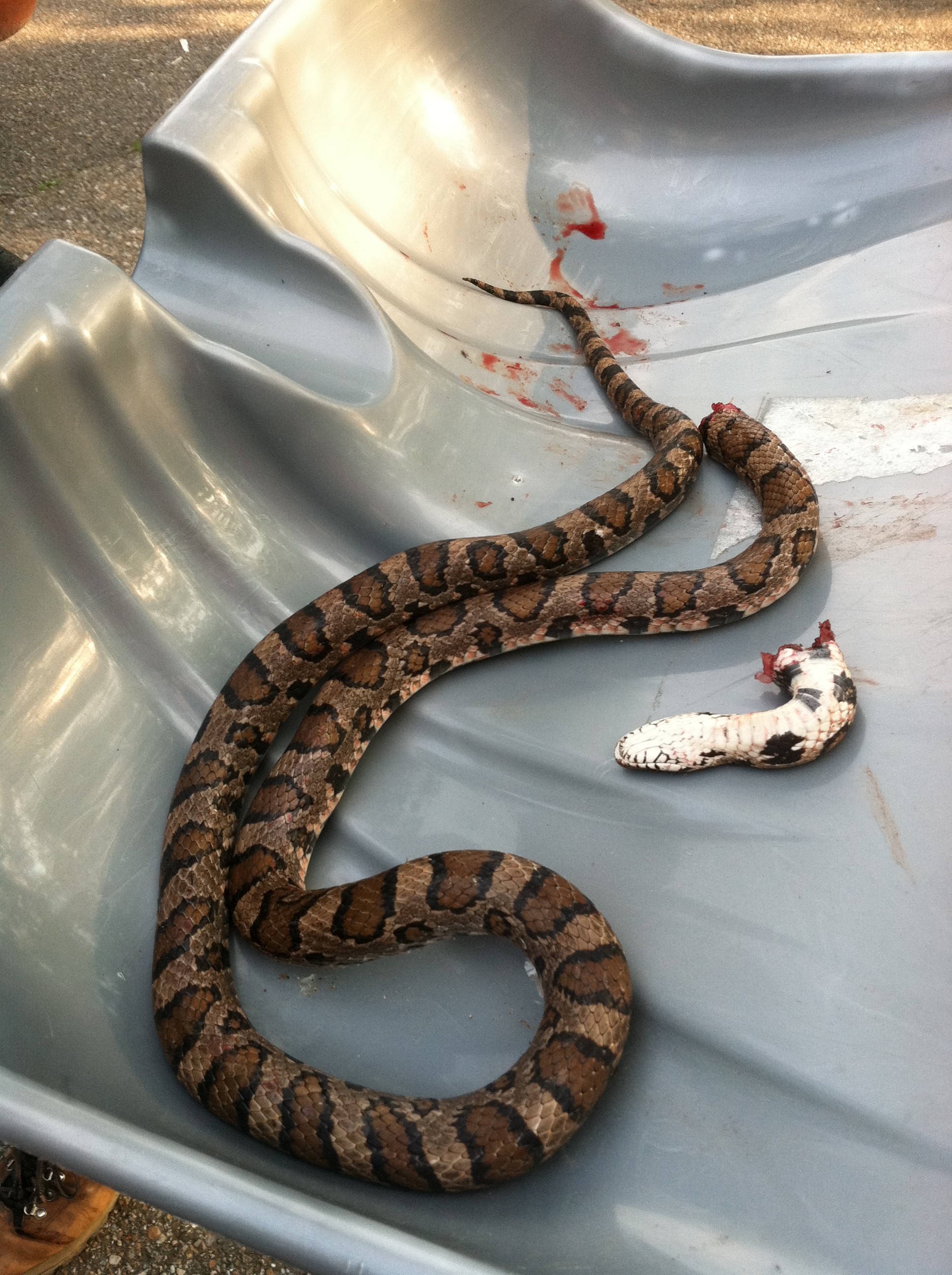Upon realizing that the children were becoming more scared of the unholy scene their mother was making than they were by the sight of the actual snake, OINKdaddy grabbed the shovel and stunned the thing with a good whack. I reached for the spade before it could get away and with one slice, it was done.